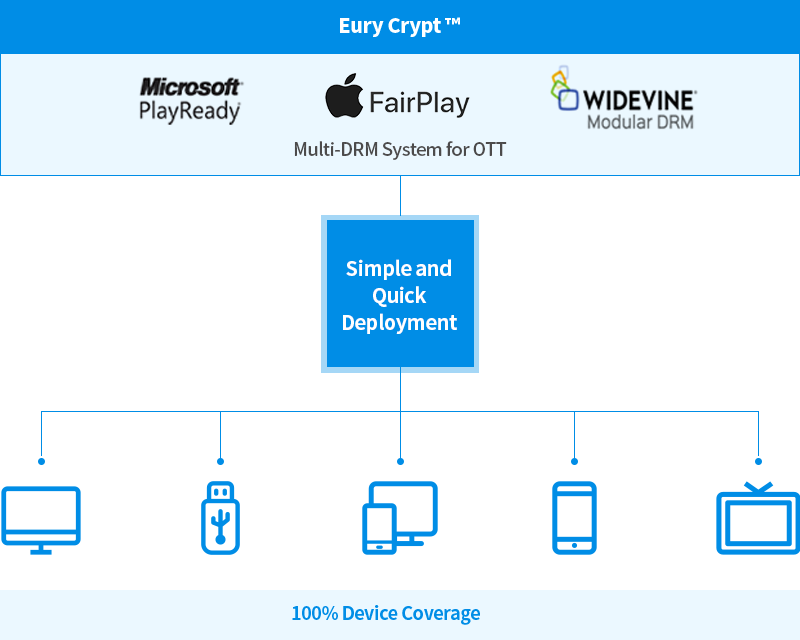 코어트러스트의 Multi-DRM 플랫폼인 EuryCrypt™는 Pay TV 사업자들에게 다양하고 파편화되어 있는 DRM을 통합 제공하여 OTT 서비스 구현을 보다 빠르고 안정적으로 지원하기 위한 제품입니다. CENC 기반의 Microsoft PlayReady와 Widevine Modular 및 Apple의 FairPlay를 기본 제공하며, 사업자의 요청에 따라 CENC 기반의 De Facto DRM을 추가 할 수 있는 구조로 설계되어 있습니다.