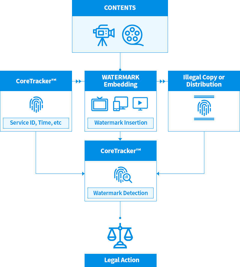 CoreTracker™는 최신의 Forensic Tracking System 입니다. 비인지적 워터마크에 이용자 식별 정보를 삽입하여 콘텐트의 불법적인 사용이 있을 경우, 이를 추적하고 색출 할 수 있도록 합니다. 다양한 서비스 플랫폼 및 화질에 대한 지원을 기반으로 사업자는 콘텐트 수급을 안정화하고 콘텐트에 대한 보안을 강화하여 향후 수익 증대를 기대할 수 있습니다.